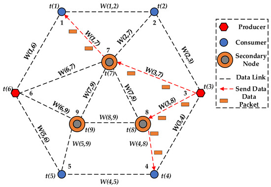 Before discussing the information acceleration transmission strategy proposed in this paper, we need to introduce the concept of the secondary node. In a random NDN network, we select some nodes to become the secondary nodes, and assign them higher bandwidth and larger cache to speed up the packet transmission in the network. These nodes usually have higher transmission capacity and communication weight, are connected to more nodes, and undertake more frequent data packet forwarding tasks, as shown in Figure 2 (Figure 2 does not represent the real topology network). Therefore, the secondary nodes are the routers with higher bandwidth and larger cache for storing the updating data of the producers first and pushing these data to all the receivers attending to the blockchain-based application, which is different from ordinary routers of the NDN.