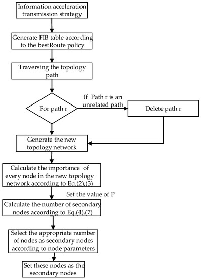 In this section, we will introduce the information acceleration strategy in detail. The core of the information accelerated transmission strategy is to calculate the importance of each node, select an appropriate number of nodes as secondary nodes according to the network situation, and give a larger bandwidth and a higher cache to help the network distribute data and reduce redundancy. Equations (2)–(7) give the calculation method of the above parameters. The specific flowchart is shown in Figure 3. The detailed process is as follows:
