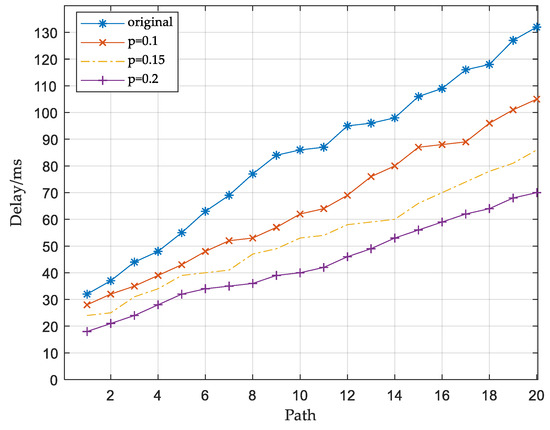 In this section, we will introduce an acceleration strategy to optimize the NDN net-work, and compare the performance of the Bitcoin system before and after the acceleration strategy is introduced. The network topology used in this section is the same as the previous one. In the previous simulation, we set P = 0.15 based on the real network data, and calculated the number of secondary nodes based on the P value. However, there are peaks and underestimations of traffic in the network, the value of P will also change and affect the number of secondary nodes. Because changes in the number of secondary nodes can affect the performance of the AITS strategy, we selected a set of P values for simulation experiments and compared them with the original network, the value of these P has a 5% fluctuation relative to the real network value, as shown in Figure 5. The original algorithm in Figure 5, Figure 6 and Figure 7 represents that the blockchain uses the NDN network for information transmission, but no additional information acceleration strategy is applied. It can be seen that in complex networks, as the transmission path in the network becomes longer, the node receiving delay increases significantly, but the use of the AITS strategy (accelerated information transmission strategy) can significantly reduce this delay. The simulation results show that compared with the original algorithm, the AITS strategy can significantly reduce the transmission delay, and the reduction is determined by the number of secondary nodes, the higher the P value, the higher the number of secondary nodes in the network, and the better the performance of the AITS strategy.