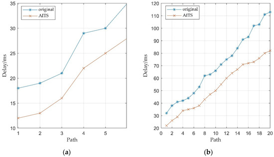 Another advantage of the AITS strategy is reducing the data overhead, which means reducing the redundant transmission of the data. Since the secondary node stores the data packets sent by the miner node, it distributes directly from the secondary node to the destination when it needs to distribute to another node on the path, which reduces a large amount of data overhead. We select 20 miner nodes to observe the packet overhead sent when it broadcasts information to the entire network. As shown in Figure 7, after the introduction of the AITS strategy, the data overhead of all miner nodes has been significantly reduced, the reduction depends on the distance between the miner node and the secondary node. The closer to the secondary node, the fewer data packets are repeatedly requested, and the data overhead is reduced. The simulation results proved this. The simulation results proved the excellent performance of AITS in reducing data overhead in complex network conditions.