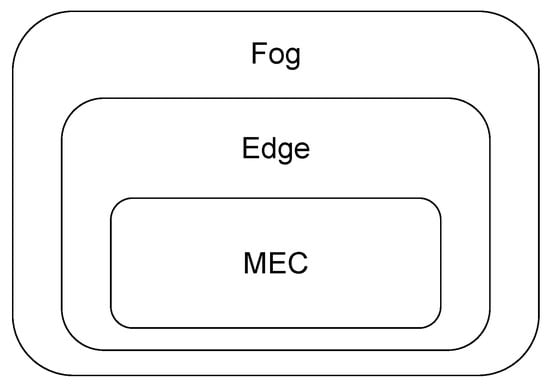 Several terms are used in the literature to describe the computing collaboration among the end-user, the nearby server, and the cloud. They include fog computing [26], edge computing [27], and MEC [28]. Compared with the “cloud”, the “fog” is closer to the “ground” (e.g., the IoT data source). It refers to the extended part of cloud computing, including distributed resources, wired and wireless data transmissions, and intermediate layers between edge and cloud. Edge computing, however, focuses on the task of executing using edge nodes in the RAN outside of the core network. Furthermore, mobile edge computing is a form of edge computing that includes the data caching and computation offloading strategies within the mobile network [29]. Moreover, recent interests in MEC reflect the practical situation with multi-technology RANs in edge computing [30]. It covers access points, hot spots, routers, etc., to establish an edge network. In this review, we use the acronym “MEC” to stand for multi-access edge computing, which also encompasses mobile edge computing. The relationships among fog computing, edge computing, and MEC are, thus, illustrated in Figure 2.