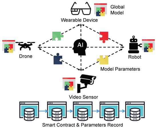 Traditional AI solutions, including deep learning and reinforcement learning, require the centralized governance of data. A single learner should gather data and computing resources for learning machines and agents before the training exercise. This centralized architecture leads to several issues, such as single points of failure and personal data leakage [40]. As mentioned above, blockchain is a decentralized and distributed record system. This characteristic is very suitable for deploying AI solutions in distributed IoT systems. Moreover, collaboration and trusted data sharing among learning machines could be realized by blockchain technology. In this review, we focus on introducing smart contract-based AI, especially the federated AI solution.
