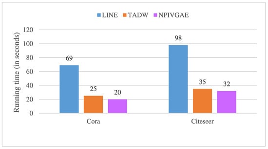 31]) for comparison. LINE embeds a large-scale information network into a low-dimensional vector space while retaining the first-order and second-order similarities. TADW is a matrix factorization method that combines network structure and text features to obtain a better network representation. We conducted experiments on the semi-supervised node classification task with the Cora and Citeseer datasets as examples. To be fair, both TADW and our model NPIVGAE were iterated 50 times. We report the running time in