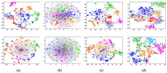 32] is applied to visualize the embeddings of the nodes. We paint nodes according to their true labels, and the nodes belonging to the same category will be painted in the same color. From the second row of