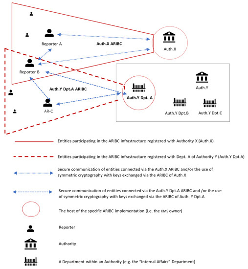 In Figure 1, authority X hosts an instance of ARIBC. A number of reporters, including Reporter A and Reporter B have registered with Authority X and can communicate securely with it. Department A of Authority Y also hosts an instance of ARIBC, with which a number of reporters, including Reporters B and C have registered. Note that a reporter may have registered with more than one instances of ARIBC. Both instances of ARIBC offer to their registered reporters confidential communication, authentication and integrity services. Note also that reporters registered with either instance of the ARIBC can securely communicate with each other as well; however, such communication cannot be in their capacity as reporters of a particular incident, because no entity other than each reporter him/herself and the authority to which the report has been submitted has the knowledge to associate an incident with a reporter of the incident.