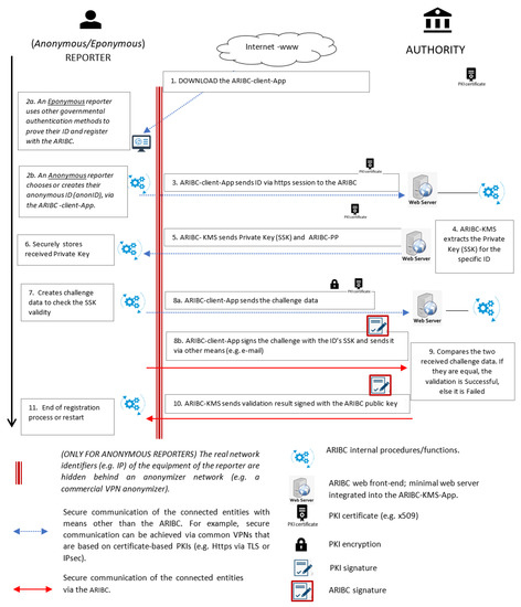 The registration procedures for both the anonymous and the eponymous reporter are shown compactly in Figure 2. In Figure 2 blue-colored arrows indicate communication protected by TLS VPN (i.e., a typical https/TLS connection that uses a typical site certificate), whilst red-colored arrows indicate communication protected by means of the ARIBC services. Note that the anonymous reporter needs to select (or create) her/his to be subsequently linked to her/his private key. This can be any string, including the output of a cryptographic hash function of the reporter’s choice. If this option is followed by the reporter, it is also possible, should the reporter wish, for example, to benefit from a reward, to prove her/his identity by presenting the key to decrypt her/his (hashed) .