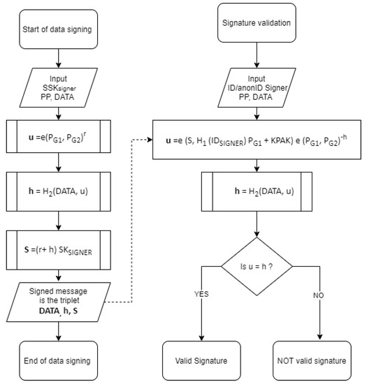The ARIBC offers the capability of signing all types of data of the ARIBC instance operator and of its registered users. Anyone, including users not registered with the ARIBC, can verify the signature, consequently the authenticity and integrity of the signed data. Two entities are involved in the signing process, namely the Signer and the Verifier. The Signer signs the data with her/his digital signature and the Verifier verifies the validity of the signature and thus the authenticity and integrity of the signed data. The Signer can be any registered user of the ARIBC that has a valid Private Key issued by the specific ARIBC-KMS. The Verifier can be anyone, s/he only needs the publicly available of the Signer and the Public Parameters of the specific ARIBC-KMS to validate the signature. The Integrity and authenticity service is implemented by means of the Signature Generation operation and the Signature Verification operation, which are based on the BLMQ identity-based signatures operations [5,42]. Note that we choose to define , to avoid arithmetic during verification; a description with , and signed messages in would be equally secure, while keeping the signature as short as possible in practice.