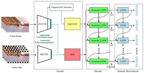 - S2VT [20] is an encoder–decoder framework with two layers of LSTM, where the first layer encodes the video representation and the second generates video descriptions.