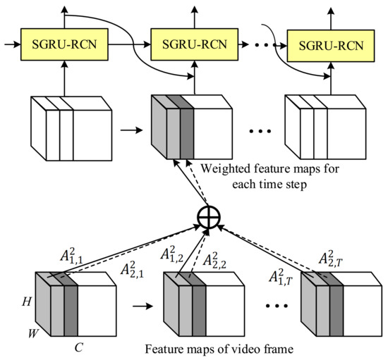 where and is computed at each time step t inside the SGRU-RCN encoder, it denotes the attention weight of i-th frame’s channel c at time step t. The value of attention weight reflects the relevance of the i-th temporal feature of each channel in the input video given all the previously generated assignments. denotes channel c’s feature map of i-th frame. Concatenating all the can get the feature maps with shape , which is the same as the original shape of feature maps of one frame. We obtain the attention weight by normalizing the relevance scores :
