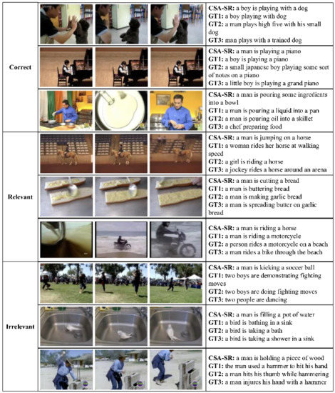 Examples of correct, relevant and irrelevant video captions. CSA-SR denotes the sentence generated by our proposed model based on channel soft attention and semantic reconstructor. GT1, GT2 and GT3 denote the ground-truth sentences.
