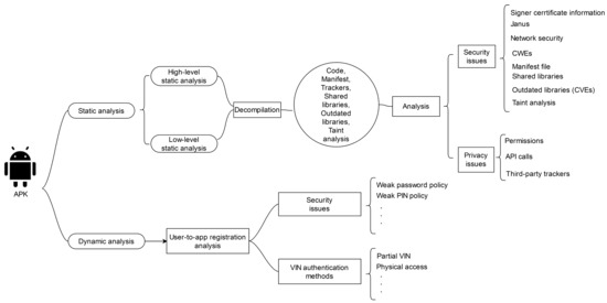 Thus, far, considerable work has been devoted to addressing security and privacy in vehicular network systems for intelligent transportation system (ITS) usages [8]. Nevertheless, while in this ecosystem, connected car apps are a popular subject, little research has been conducted so far towards evaluating them under the security and privacy prisms. Mandal et al. [9] presented a static analysis approach to discover software vulnerabilities in Android auto infotainment apps [10]. They examined more than 20 infotainment apps available in Google Play at that time, and concluded that nearly 80% of them were potentially vulnerable. Panarotto et al. [11] examined the OpenXC library (http://openxcplatform.com/ (accessed on 20 February 2021)), which provides Android apps with a way, i.e., API, to interact with the car’s hardware, and showed how this library can be exploited in the context of injection attacks. Furthermore, the authors proposed a static analysis approach which, according to the authors, nips such attacks in the bud. Recently, Wen et al. [12] proposed a cost-effective and automatic, i.e., no human intervention required, system called CANHUNTER, for reverse engineering of CAN bus commands using just connected car apps. These apps fundamentally rely on the CAN bus commands to engage with the vehicle and achieve compatibility with existing in-vehicle systems. The authors evaluated CANHUNTER by testing it on more than 200 on-board diagnostics (OBD) dongle and in-vehicle infotainment car apps acquired from both the official iOS and Android app markets.