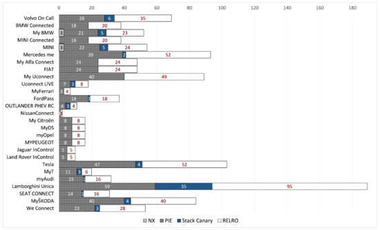 As seen from Table 2, all apps requested at least two dangerous permissions. Specifically, a total of 10, 9, 8, and 7 such permissions were asked by 3, 5, 6, and 5 apps, respectively, while only one app requested the least number of two permissions of this kind. Not less important, all apps requested the ACCESS_FINE_LOCATION permission (P7), and the vast majority of them permission to read and write the external storage (P11 and P12). Moreover, from the same table, it can be inferred that apps of the same automotive group may present an identical or nearly identical distribution of permissions. For instance, this observation stands true for the PSA, and partially for the Mitsubishi and Tata groups. Furthermore, the same allocation of permissions may be perceived for certain apps within a group, e.g., the two “connected” apps in the BMW group.