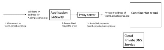 The container holding their notebook is in a private IP network space [33] that is not directly accessible to users on the Internet. For step 3 to work, we need a way to name the container and register that name into a private DNS space. Our Cloud Service Provider has a DNS service that can be manipulated programmatically, so we use a private DNS domain for our containers’ names. In Figure 2, this host name for the container with team1′s notebook is team1.privatexprize.org.