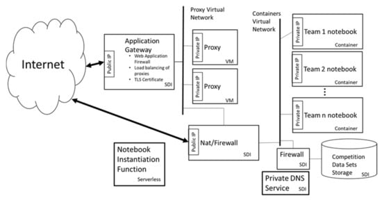 The containers containing teams’ notebooks are also on a separate segment. This segment has access lists that restrict where on the Internet the notebooks can connect. Teams can download software to their notebooks from a limited number of software repositories. Another firewall controls access from the containers to the datasets used as the basis for competition. These datasets are also stored in the Cloud on SDI.