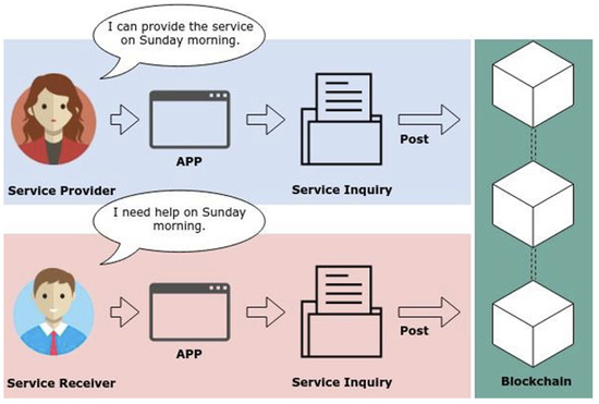 - Step 1: Members need to post their service inquiries to the blockchain, where the service inquiries have two types. SPs post the supply inquiry, and SRs post the demand inquiry. Then, the service inquiry reveals the user’s specific content of the supply or demand service, and it will be posted to the blockchain through the client-side application software, as shown in Figure 1.