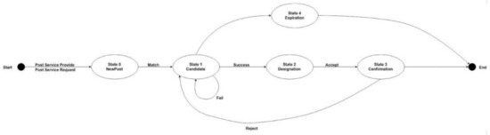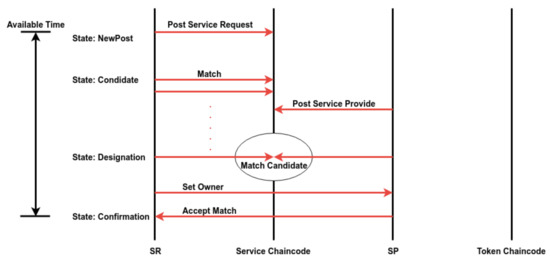 Figure 6 shows the detailed transaction flow of the service matching process. First, an SR posts his or her service inquiry onto the blockchain. If the posting process is successful, the service inquiry’s state changes to the state “NewPost.” Second, as long as that service inquiry is alive, the client app will automatically invoke the match function at a fixed frequency. And the state of the service inquiry will be searchable by other services when its state is denoted as a “Candidate.” After posting the service inquiry, our system will upload the service-related data to the blockchain. The target SR will find the candidate SP’s service inquiry when the matching function is invoked next time. Third, after the service inquiries of the SP and the SR fulfill a matching strategy, the target SR sets the “serviceOwner” of the matched SP to himself or herself and vice versa. Finally, the SP can choose to accept or not accept this service match. If not, both parties will return to their candidate state and continue to look for other compatible service inquiries.