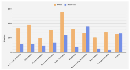 Figure 5 shows some service substances taken from TimeBanks USA and their supply-versus-demand ratios. It is worth mentioning that the number of offers may not be realistic. When someone wants to join the TimeBanks USA, they need to tell the system what services they can provide. When someone needs help, the TimeBanks USA’s staff will use the phone to ask members to provide the service. Therefore, the number of members who can provide services must be less than the number of offers in the figure. For simplicity, we select the three most demanded services as the service substances in the proposed system, including HelpatHome, CommunityActivities, and Home.