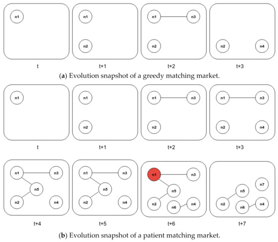 As shown in Figure 7, the node ni where i = 1, 2, …, 5 arrives at the market in order. If each node matches immediately upon arrival, nodes n1 will find a match whenever node n2 comes at the market, and then no node can be matched with node n3 when it arrives at the market. On the one hand, if each node prefers to wait for a while, nodes n1 will have the other matching choices. This situation is an example of the so-called timing issue. On the other hand, at this moment, node n1 could choose nodes n2 or n3 but not both of them; this situation clearly shows a structural issue.