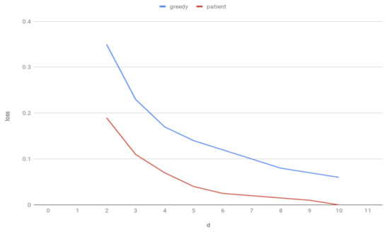 The computed system losses with respect to the number of expected links per node, d, for the patient and the greedy matching strategies, are shown in Figure 10.