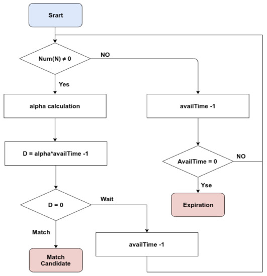 In Equation (3), NOAI denotes the number of available times remained in the lifecycle interval for the service inquiry, m is the maximum time of the service inquiry when invoking a matching process in its lifecycle. For example, if m = 10 and the service inquiry Si have failed to get match four times in the current pairing procedure, then NOAI = 6. Assuming α = 0.5, then TH = 5. Now (NOAI − TH) = 6 − 5 = 1, D = Wait, and Si will continue to wait until the next call for the matching function. As one more matching period passed, Si in the new matching process will have NOAI = 5. Assuming α = 0.5 again, then D = Match, and the corresponding Si will try its best to match one of its neighbors and leave the market. Furthermore, the longer a node remains on the market, the easier it finds a match. Therefore, all nodes in the market will operate according to the remaining feasible time and have the characteristics mentioned above.
