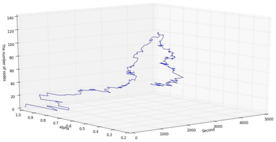 In Figure 13, we use a DTS-based matching algorithm to simulate the matching scenario in the time banking system. Unlike previous simulations, no service will arrive at the market after a certain point in time. This simulation will show that when the service to the market changes drastically, the system’s strategy will automatically tune the alpha and maximize the overall matching rate.