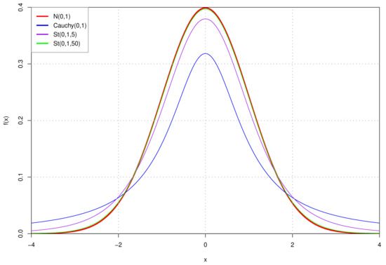 In the real world, many observed phenomena do not follow the frequently-used Gaussian distribution, and a more permissive distribution should be used to describe them. The Student’s t distribution (St) [41], as the most frequently used heavy-tailed distribution, differs significantly from the Gaussian distribution, the thickness of tails is modulated by the dof parameter . The smaller the dof parameter , the flatter the St distribution, meaning the lower the middle of the curve, the higher the tails rise. In Figure 1 and Figure 2, we compare the St distribution with other similar probability distributions. As the dof , the curve is the Cauchy distribution, and as the dof , the curve is the Gaussian distribution. Overall, the lower dof in distribution will result in the more permissive of outliers. The probability density function (pdf) of the multivariate St distribution is: