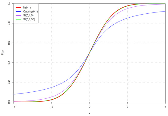 Several cumulative distribution function curves of common probability distribution. They share the same mean and scale parameters, and there are two St distribution with dof parameter 5 and 50, respectively.