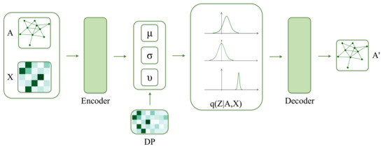 The architecture of the DP-St GVAE. The encoder is a graph convolutional neural network that integrates the network structure A with node feature X and, by extension, generates the node representation Z. The decoder reconstructs a graph from the inner product of the node representation Z.