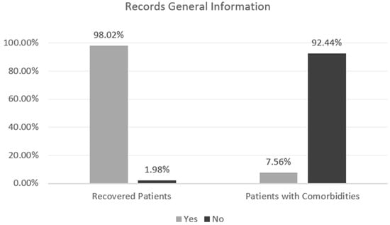 For the reader to obtain a global perception of the data, Figure 2—Records General Information presents some relevant information to retain. According to the presented figure, it is possible to perceive the gap between records of recovered and infected patients, a crucial detail that can influence the result in the modeling phase; for example, the number of dead patients only represents 1.98% of the cases. The percentage of patients who present comorbidities prior to infection caused by the SARS-CoV-2 virus can also be understood.
