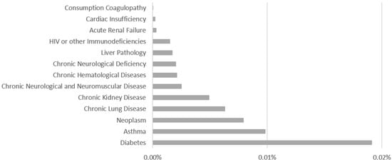 The comorbidities noted by health professionals are the following: Diabetes, Asthma, Neoplasm, Chronic Lung Disease, Chronic Kidney Disease, Chronic Neurological and Neuromuscular Disease, Chronic Hematological Diseases, Chronic Neurological Deficiency, Liver Pathology, HIV or other Immunodeficiencies, Acute Renal Failure, Cardiac Insufficiency, and Consumption Coagulopathy. The comorbidities distributions are shown in Figure 3—Comorbidities Distribution and how it is possible to perceive the comorbidities with the largest number of associated records are: Diabetes, Asthma and Neoplasia.