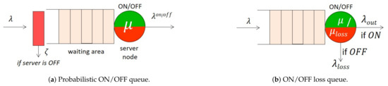 With regard to the server, we assumed that its operation followed an on–off procedure. More specifically, the server remains for an exponentially distributed time, with parameter , in the ON state. While in that state, the server provides service to messages. Let be the time during which the server is ON. Upon the expiration of this time, the server enters the OFF state for an exponentially distributed period with rate . While in that state, the server stops providing service to messages. Let be the time during which the server is OFF. Similar to the M/M/1 queue, an ON/OFF queue can be defined via the tuple:
