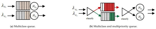 This queue model’s uninterrupted serving (transmission, reception, or processing) of messages belonging to different classes. Such classes are used to categorize messages of IoT interactions that have different characteristics. For example, sensor data, video streaming services and transnational messaging require different transmission and processing resources. Each class corresponds to the common M/M/1 queue (see Figure 1a), featuring Poisson arrivals and exponential service times; thus, multiple M/M/1 queues are used to form the multiclass queue (see Figure 3a).