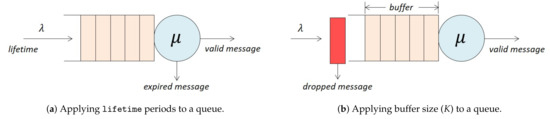 Up to this point, we considered queueing models of which the buffers have infinite capacity, and arriving messages simultaneously have an infinite lifetime. This affects both the ratio of successfully served messages and the response time. However, it may be unrealistic to model IoT interactions with such characteristics. As an example, in the case of the long disconnection period of an IoT sensor (e.g., 30 min), the produced messages may well exceed the buffer capacity of the IoT sensor, and some of the oldest messages (data) may simultaneously become obsolete. We now describe the features that can consider such constraints and apply them to the already defined queueing models.