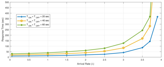 We set the ON/OFF mode parameters as follows: (i) the server remains in the ON and OFF states for exponentially distributed time periods = = 20/40/60 s; thus, the server changes its state every 20, 40, and 60 s, respectively; (ii) messages are processed with a mean service demand D = 0.125 s; (iii) there is sufficient buffer capacity so that no messages are dropped; and (iv) messages arrive to the queue with a mean rate varying from 0.05 to 4 messages per sec ( = 4 messages/s). By applying rates greater than 4 messages/sec, the system saturates. Using the above settings in our simulator, we ran the system and derived the simulated curve of the mean response time for several rates as depicted in Figure 5.