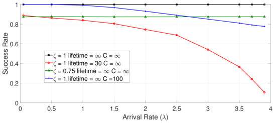 Success rate vs. response time: In order to investigate the trade-off between success rates and response times, the rates of successful message service are presented in Figure 7 for the same set of experiments. In the first experiment, there was a 100% message success rate since no messages were lost. Lowest rates were observed in the case of lifetime periods and increased arrival rates. In the third experiment, low arrival rates led to high message success rates (in the range of ∼90–100%), while higher arrival rates led to a decrease (∼87–77%). Lastly, the fourth experiment led to a stable message success rate (75%).