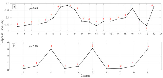 In Figure 8b, we define 9 classes (i.e., ) but with the server utilization defined as . Therefore, the system was close to the saturation point, and classes assigned with lower priorities thereby experienced high response times. On the other hand, despite the fact that the system was almost saturated, high-priority classes experienced low response times.