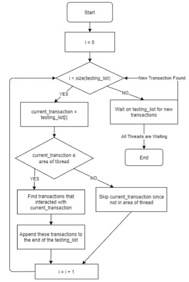 | testing_list ← list of malicious transaction(s) threads <- list of threads covering the various areas Each thread will run the below steps: i ← 0 while not all threads are waiting on testing_list do if i < size(testing_list) then current_transaction ← testing_list [i] if current_transaction ∈ area of thread then find transactions in area that interacted with current_transaction append these transactions to testing_list if not already in it else skip current transaction since out of thread’s area endif i ← i + 1 else wait on testing_list for new elements endif endwhile |