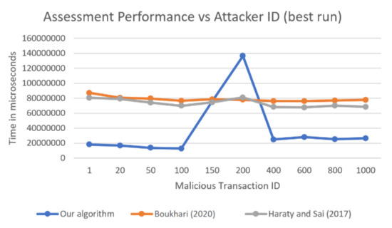 The proposed algorithm was faster than the other two algorithms (presented in [10] and [11]) for almost all transactions except for two: 150 and 200. It is clear in Figure 5 that in the average of all 10 runs for attacker ID 1, our algorithm was almost five times faster than the Boukhari approach [11] and more than four times faster than the Haraty and Sai [10] approach. It was also four times faster than the other algorithms for malicious transaction IDs 20, 50, and 100. For transaction IDs 400, 600, 800, and 1000, our algorithm was more than twice as fast as the other algorithms. For transaction ID 150, our algorithm had almost the same running time as in [10] and could be still considered competitive. The only problem was transaction ID 200, which will be explained later in this section.