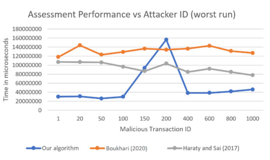Comparison of the worst times of three algorithms as a function of the malicious transaction ID.