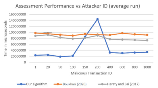 Comparison of the average times of three algorithms as a function of the malicious transaction ID.
