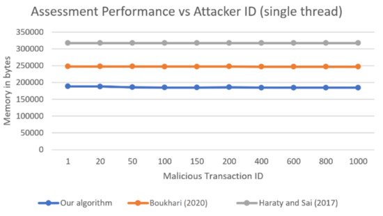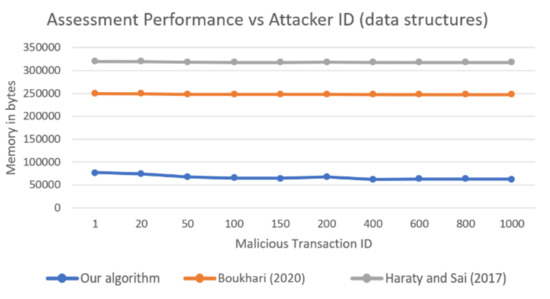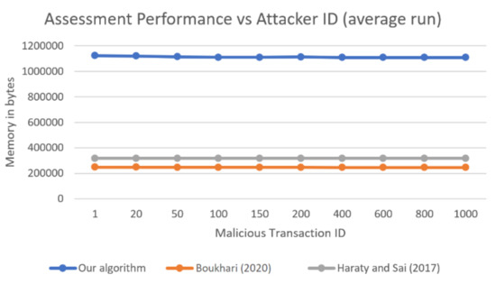 Figure 6 shows a comparison of the average of 10 runs for each of the three algorithms over the studied malicious transaction IDs. Note that the memory did not change between the runs, since it did not depend on variables such as the CPU, 550 database response time, or available cores, so the reported average was also the recorded memory for each of the 10 runs. All memory results are reported in bytes.