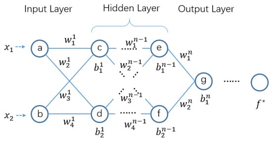 Here, we propose a federated multi-layer perceptron algorithm (FMLP) based on the traditional multi-layer perceptron. FMLP can train a simple model for each client in a multi-party data areolation environment through gradients’ sharing. The multi-layer perceptron, also known as a deep feed-forward network, is a typical deep learning model. An example of its architecture is shown in Figure 3.
