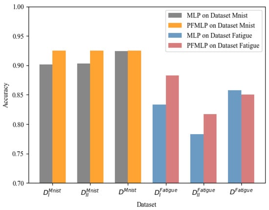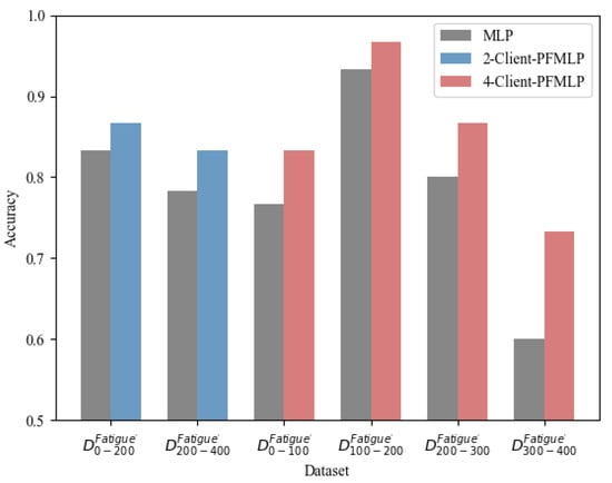Accuracy comparisons among single-node MLP, 2-client and 4-client PFMLP on the fatigue dataset.
