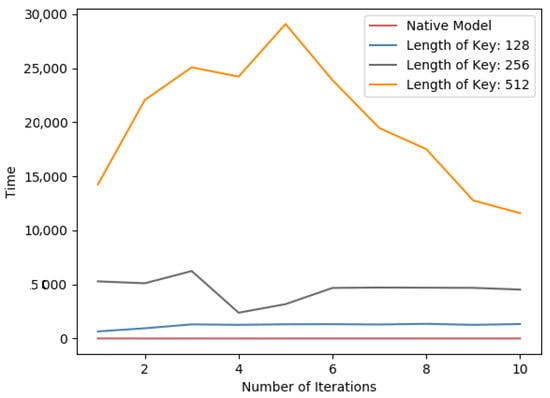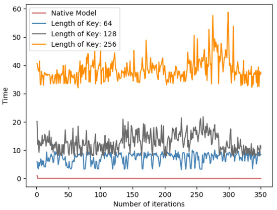 From the above experiment, it shows that, under the same model and the same key length, 4000 pieces of data take 358.14 s per iteration, 8000 data 733.69 s, and 12,000 data 1284.06 s. Thus, it says that the time overhead is positively related to the amount of encrypted data.