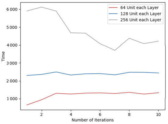 Therefore, since the algorithm requires encryption for the gradient matrix and more hidden layer units, the time overhead will increase proportionally. In addition, as the number of units in the hidden layer increases, the amount of data to be transmitted in the network also increases. In order to reduce the time overhead of the PFMLP algorithm, under the premise of ensuring the accuracy, the number of hidden layers and each hidden layer units should be reduced as much as possible.