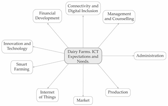 In order to provide a clear and ordered representation of the results, we generated a diagram of dairy farms in relation to the farmers’ expectations and needs concerning the ICT in all the areas connected to their business (Figure 1). This selection led to the division of this paper into nine thematic areas. The main focus was the dairy farmers’ relation with the Administration.