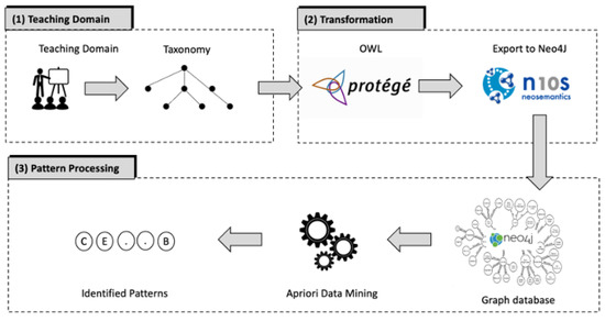 Teaching and learning are highly individualized processes and sharing best practices in teaching can be difficult because each teacher’s teaching characteristics are different. Hence, the description of effective teaching scenarios in a reusable way is often an essential requirement to ensure sustainability in good teaching practices [1]. This led to the idea of using a pattern approach to capture teaching practices [2,3]. If domain-specific teaching and evaluation data are available in a database, the use of pattern mining techniques can help to identify candidates for effective teaching patterns. Once patterns are identified, they describe the essence of effective teaching scenarios for reuse in practice. The pattern approach, originally introduced by Christopher Alexander in the field of architecture [4,5], was later applied in computer science in object-oriented design [6] and also in education to describe teaching–learning scenarios in schools [7,8,9] and in tertiary education in the field of technology-enhanced learning [10,11]. In this paper, we describe a semi-automated approach, which is based on related work in the field of digital humanities [12,13] and further combine expertise from different domains such as educational science, computer science, and teaching practice.