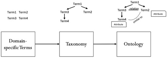To identify domain-specific teaching–learning patterns, teaching sequences are collected in a database, which is domain-adequately structured. The conceptual modeling process towards a data-model for such a domain-specific database follows an approach from ontology engineering, where different approaches are discussed [18,19,27,28,29,30]. A common approach is to first describe a glossary with a list of domain-related terms/words and their definitions, which are then arranged into a taxonomy that is subsequently transformed into an ontology. Frequently, a thesaurus (identification of synonyms and similarities) and topic maps (attributes and relationships) are considered separately, but in this case they are combined in the step of the ontology. This process is illustrated in Figure 2. It can be seen that although terms in a taxonomy are connected (in a generalization/specialization), the transformation to an ontology also adds properties to the nodes and relationships.