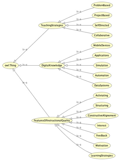 While a taxonomy represents a domain in categories and sub-categories, an ontology adds to the taxonomy further semantics with relationships between the (sub)-categories and also defines further details. Using a web ontology language (OWL, specified in [32]) the taxonomy is transformed into an OWL ontology supported by the modeling software Protégé (https://protege.stanford.edu accessed on 19 April 2021) [33], which is an open-source ontology software with a visual editor supporting different modeling languages [34,35]. The concept of an OWL ontology is basically consisted of the components of classes, properties and optionally instances, defined by a list of triples: subject, predicate, object, where a subject is in relation to an object. Considering the root class digital didactics in Figure 3, multiple classes are defined on the next levels, for instance digital knowledge and one of its sub-classes mobile devices. Whereas (sub)-classes describe concepts, the OWL definition of instances describes specializations of them as concrete instances of a class. In the taxonomy above, no instances are specified, as in our approach the taxonomy serves as a model for the ontology. Based on this, the following ontology depicted in Figure 4 was developed from the taxonomy (as can be seen, some sub-classes were added to FeaturesOfInstructionalQuality during the modeling process).