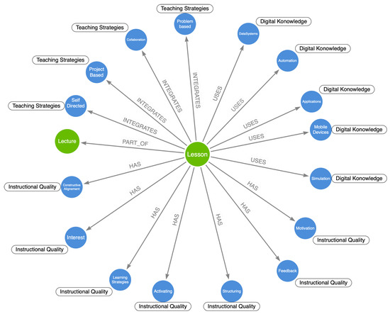 Even though Protégé provides tools for simple data visualizations and techniques to analyze data, graph databases provide a more intuitive way to explore a graph-based data-representation [36]. As an ontology has a graph structure, a transformation from an ontology to a graph database is possible. From a technical perspective, an ontology can be converted from Protégé to a graph database into the graph database management system Neo4j (https://neo4j.com accessed on 19 April 2021) via the neosemantics (https://github.com/neo4j-labs/neosemantics accessed on 19 April 2021) toolkit [37]. Therefore, neosemantics creates in the graph database a node for each class of the ontology. If there is a relationship to another class, it creates another node, if not, neosemantics adds a property to the node [16]. With the ontology ready, the next step is to import it via neosemantics into a graph database in Neo4j. Figure 5 shows the graph database imported into Neo4j based on the ontology made in Protégé and manually edited (the node “Lecture” was added for relating single lessons to lecture series). The class-structure of the ontology thus builds the underlying framework as it sits in the database [36] and provides the corresponding classes for the actual data nodes. This nodes are connected and the properties specify the names of the nodes. From the database model it is also possible to see how it can be further extended. For example, when a new node “iPad” is added, it will be related to the node “MobileDevice”. Adding teaching data will hence increasingly create a dense network of mutually connected information. The more data are available, the more effective pattern mining can be performed. To demonstrate the approach in this paper, we will leave the amount of data at this level for better comprehensibility.